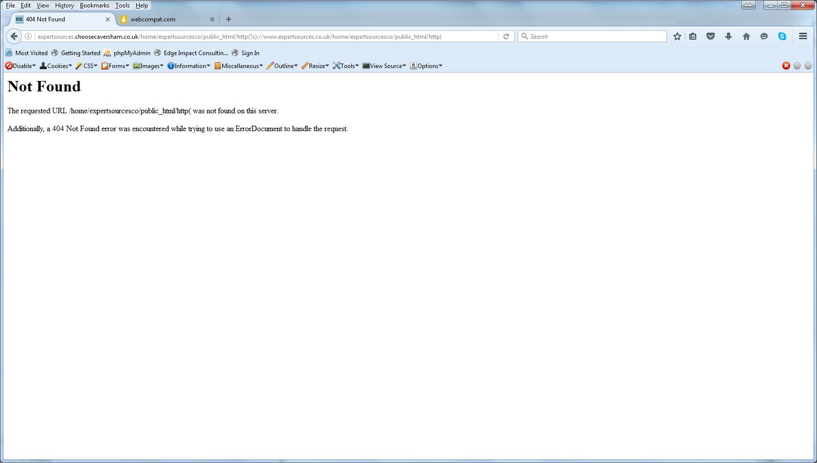 When there has been some sort of domain related problems that have subsequently been fixed, Firefox continues to display an error page when in fact the domain is fully operational and other browsers such as Google Chrome will display the correct website pages. An example of this is http://expertsources.choosecaversham.co.uk/ where we are setting up a new website for a customer and where we had a problem with the domain configuration. Due to the domain configuration error we were getting returned the URL http://expertsources.choosecaversham.co.uk/home/expertsourcesco/public_html/http(?s)://www.expertsources.co.uk/home/expertsourcesco/public_html/http(