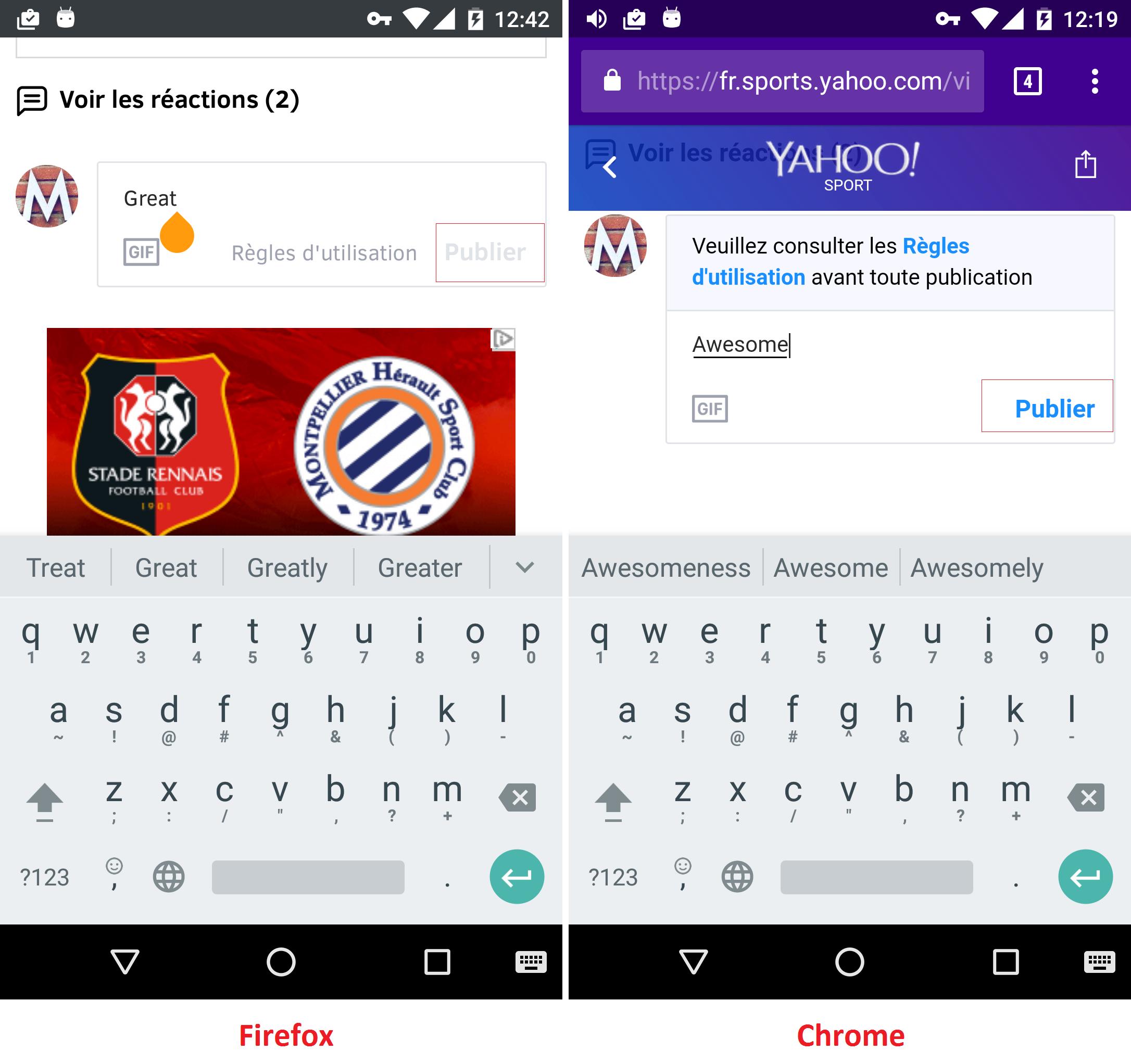 URL: https://fr.sports.yahoo.com/video/le-nouveau-dessin-faro-la-080000196.html Browser / Version: Firefox Mobile Nightly 55.0a1 (2017-05-01) Operating System: Nexus 5 (Android 6.0.1) - Resolution 1080 x 1920 pixels (~445 ppi pixel density) Problem type: Something else - I'll add details below Prerequisites Account created and signed in. Steps to Reproduce Navigate to: https://fr.sports.yahoo.com/video/le-nouveau-dessin-faro-la-080000196.html. Type in a comment. Observe “Publier” (“Post”) button. Expected Behavior: The button becomes active (e.g. blue color.) Actual Behavior: The button remains inactive (e.g. gray color.) Note: Reproducible on Firefox 52.0 Release Not reproducible on Chrome (Mobile) 57.0.2987.132. Also reproducible on US site (https://sports.yahoo.com/news/lawyer-raiders-pick-gareon-conley-now-says-accuser-consensual-sex-223954315.html). This is an UI issues, considering that the "Post" button is functional (after being tapped the comment is saved). Screenshot attached. Watchers: @softvision-sergiulogigan @softvision-oana-arbuzov sv; country: fr From webcompat.com with ❤️ Please login to edit issues. View issue on Github Shortcut: Press l on your keyboard to open the label editor. Shortcut: Press g on your keyboard to be taken to the GitHub view of this page.
