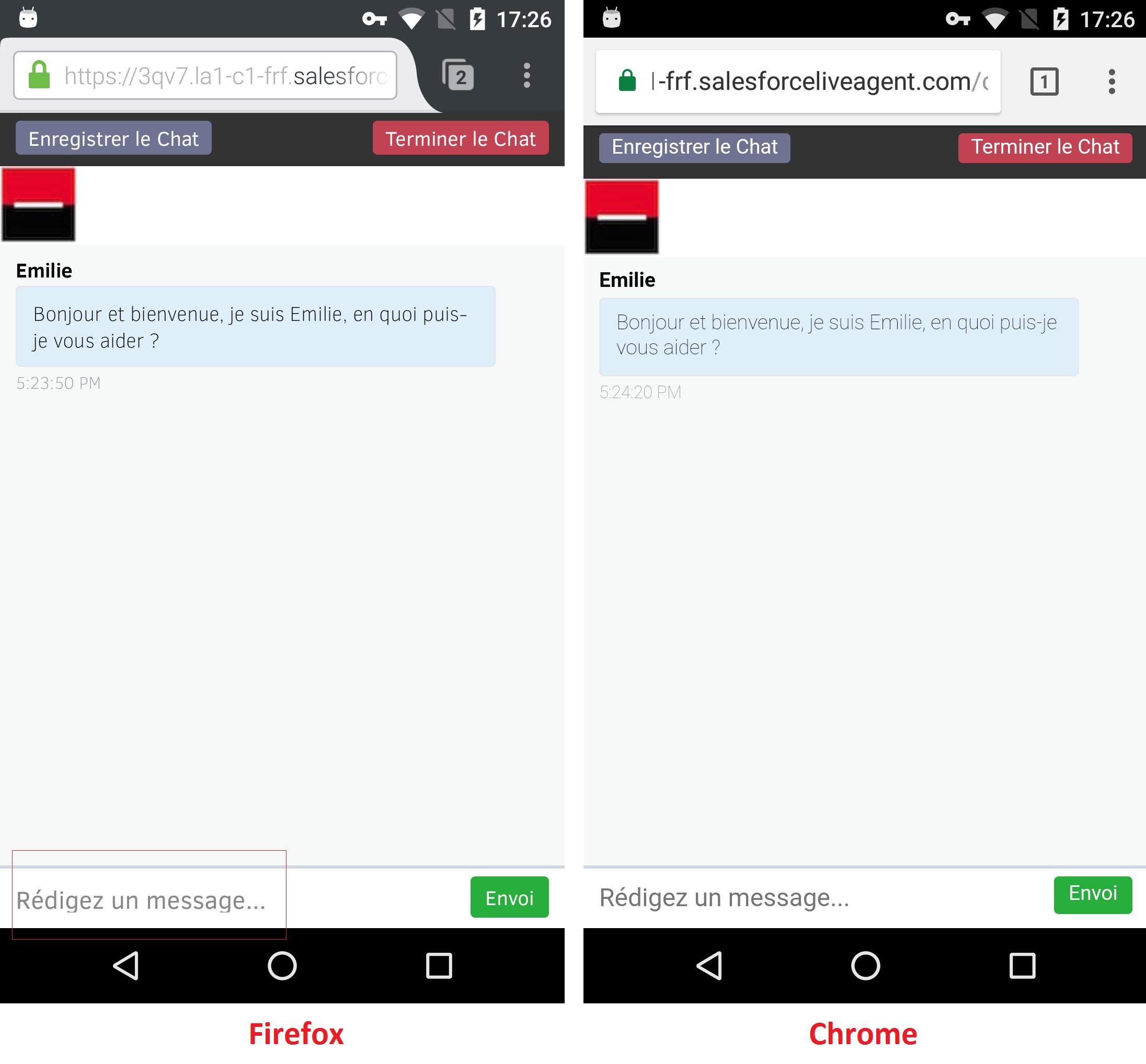URL: https://3qv7.la1-c1-frf.salesforceliveagent.com/content/s/chat?language=fr#deployment_id=57258000000040D&org_id=00D58000000OfKl&button_id=5735800000004Sj&session_id=8435f04e-685b-40db-835c-639a5cdbed35 Browser / Version: Firefox Mobile Nightly 55.0a1 (2017-05-19) Operating System: Nexus 5 (Android 6.0.1) - Resolution 1080 x 1920 pixels (~445 ppi pixel density) Problem type: Text is not visible Steps to Reproduce Navigate to: https://3qv7.la1-c1-frf.salesforceliveagent.com/content/s/chat?language=fr#deployment_id=57258000000040D&org_id=00D58000000OfKl&button_id=5735800000004Sj&session_id=8435f04e-685b-40db-835c-639a5cdbed35 Wait until “Chat” page is displayed. Observe “Redigez un message” (“Post a message”) hint text. Expected Behavior: The text is fully visible. Actual Behavior: The text is cropped. Note: Not reproducible on Chrome (Mobile) 58.0.3029.83. Screenshot attached. Watchers: @softvision-sergiulogigan @softvision-oana-arbuzov sv; country: fr From webcompat.com with ❤️ Please login to edit issues. View issue on Github Shortcut: Press l on your keyboard to open the label editor. Shortcut: Press g on your keyboard to be taken to the GitHub view of this page.