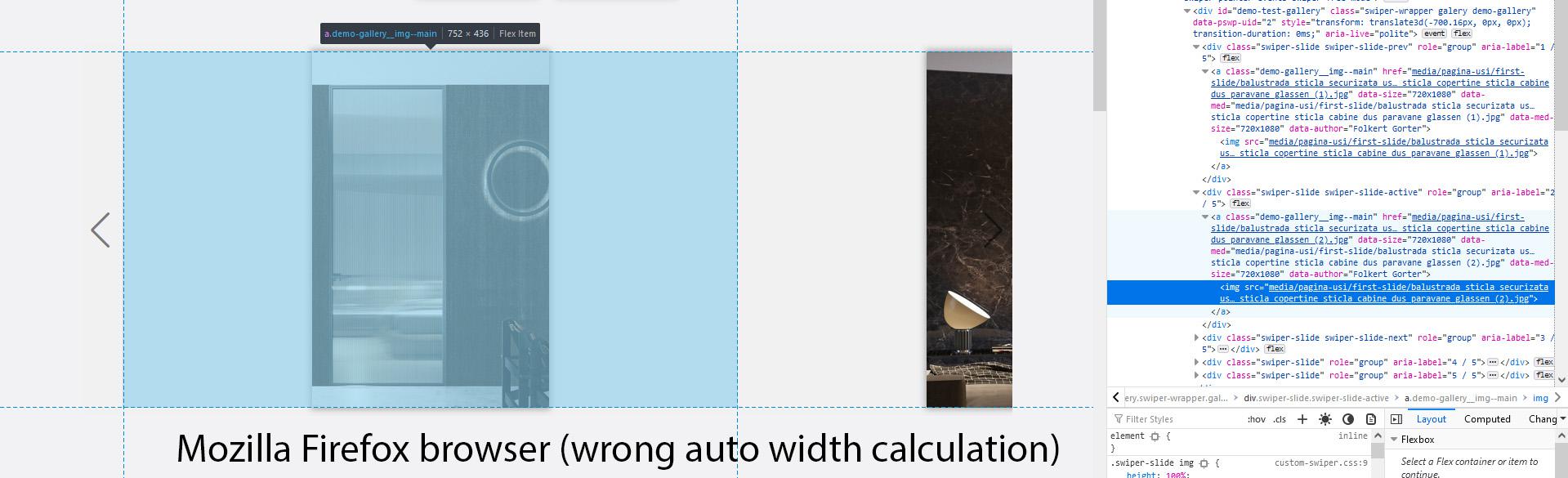 I've encountered a problem at an element rendering. Under the image thumbnails from the link I provided is placed an image swiper. It seems like Mozilla Firefox browser is miscalculating the width of the 'anchor' tag where the image is placed. It makes it wider than it should be. I've tested the look of that element on multiple browsers (Opera, Brave, Edge and Chrome aka 'Arch Nem') and this browsers seem to calculate the width of that element in a proper way. If that's a development error, please let me know. Thank you